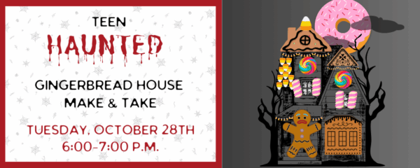 Tuesday, October 28th from 6:00-7:00 p.m. Teen Haunted Gingerbread House Make & Take Drop in and construct a haunting “gingerbread” house out of graham crackers,