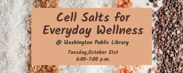 Tuesday,October 21st from 6:00-7:00 p.m. Cell Salts for Everyday Wellness Discover how Schuessler’s cell salts can be a simple, natural way to support your body