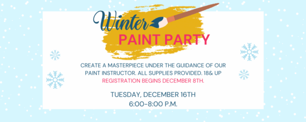 Tuesday, December 16th from 6:00-8:00 p.m. Winter Paint Party Create a masterpiece under the guidance of our paint instructor. All supplies provided. Registration begins December