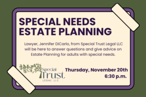 Thursday, November 20th at 6:30 p.m. Special Needs Estate Planning Lawyer, Jennifer DiCarlo, from Special Trust Legal LLC will be here to answer questions and give advice on Estate Planning for adults with special needs. Adult