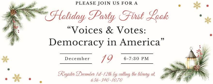 Friday, December 19th from 6:00-7:30 p.m. Holiday Party First Look “Voices & Votes: Democracy in America” As we head toward the 250th anniversary of America’s founding, Washington Public Library hosts a Smithsonian traveling exhibit that explores the history of American democracy. Join us for the reveal of this exceptional exhibition in a festive holiday atmosphere. Appetizers, desserts, and drinks will be served. Holiday attire encouraged. Sponsored by Friends of the Library. For adults 21 & up. Register December 1st-12th by calling the library at, 636-390-1070.