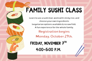 » Read moreFriday, November 7th from 4:00-5:00 p.m. Family Sushi Class Learn to use a sushi mat, work with sticky rice, and choose your own ingredients (vegetarian options and no raw fish). A fun experience for the whole family. Registration begins Monday, October 27th.