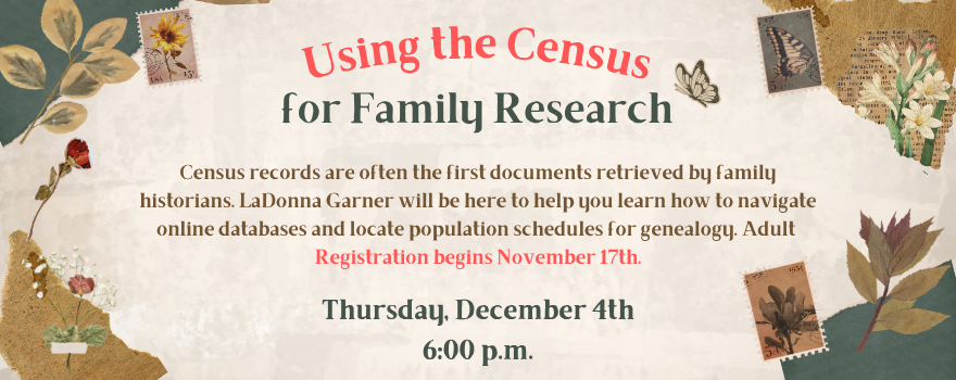Thursday, December 4th at 6:00 p.m. Using the Census for Family Research Census records are often the first documents retrieved by family historians. LaDonna Garner will be here to help you learn how to navigate online databases and locate population schedules for genealogy. Adult Registration begins November 17th.